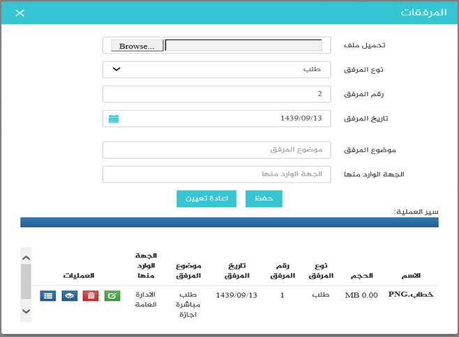 بعد الضغط على زر حفظ يعرض النظام معلومات المرفق الذي تم حفظة في جدول سير العملية حيث يشمل المعلومات التالية (الاسم ، الحجم ، نوع المرفق ، رقم المرفق ، تاريخ المرفق ، موضوع المرفق ، الجهة الوارد منها) مع امكانية تعديل وحذف وعرض المرفق و الاطلاع على عمليات المرفق .