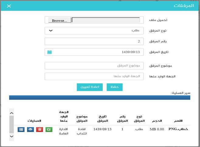 بعد الضغط على زر حفظ يعرض النظام معلومات المرفق الذي تم حفظة في جدول سير العملية حيث يشمل المعلومات التالية (الاسم ، الحجم ، نوع المرفق ، رقم المرفق ، تاريخ المرفق ، موضوع المرفق ، الجهة الوارد منها) مع امكانية تعديل وحذف وعرض المرفق و الاطلاع على عمليات المرفق .
