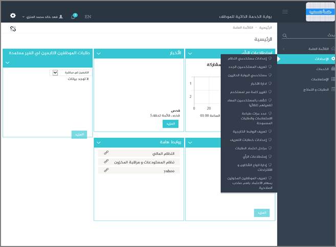 تمثل هذه القائمة كما في الشكل (0-2) مجموعة شاشات الاعدادات وتتضمن تحديد الصلاحيات للمستخدمين ، وتحديد اعدادات النظام ، و إضافة آخر الاخبار وغيره من خيارات وتفضيلات النظام ، حيث يمكن اختيار أي شاشة من القائمة ليتم فتحها ومعالجة البيانات اللازمة.